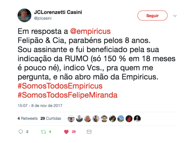O desempenho da Carteira Empiricus (190% do CDI desde a sua criação), os calls recentes de Rumo e Guararapes e por aí vai. Poderia ficar aqui, parágrafo após parágrafo, comentando os acertos do Felipe. Melhor, porém, é deixar que nossos próprios assinantes expressem como as ideias dele transformaram suas vidas financeiras: