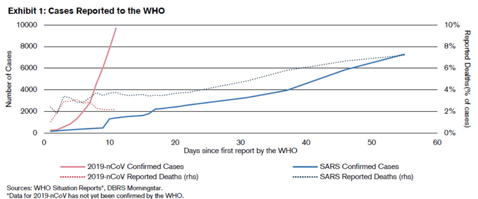 Para quem já assistiu, não há como evitar a lembrança desse enredo nesta semana em que vimos o coronavírus chegar a 9.000 casos confirmados na China, ultrapassando em números absolutos a epidemia de SARS de 2003, que, por sinal, também era causada por um coronavírus. Por outro lado, a nova versão do vírus parece ser menos letal, já que o SARS matou três vezes mais pessoas (gráfico abaixo).