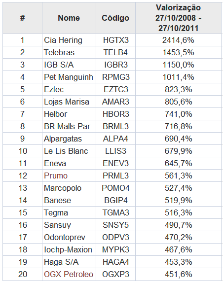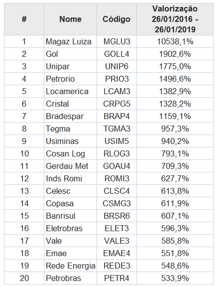 De acordo com a tabela abaixo, os 20 melhores desempenhos da Bolsa apresentaram multiplicações entre 6x e 106 vezes: