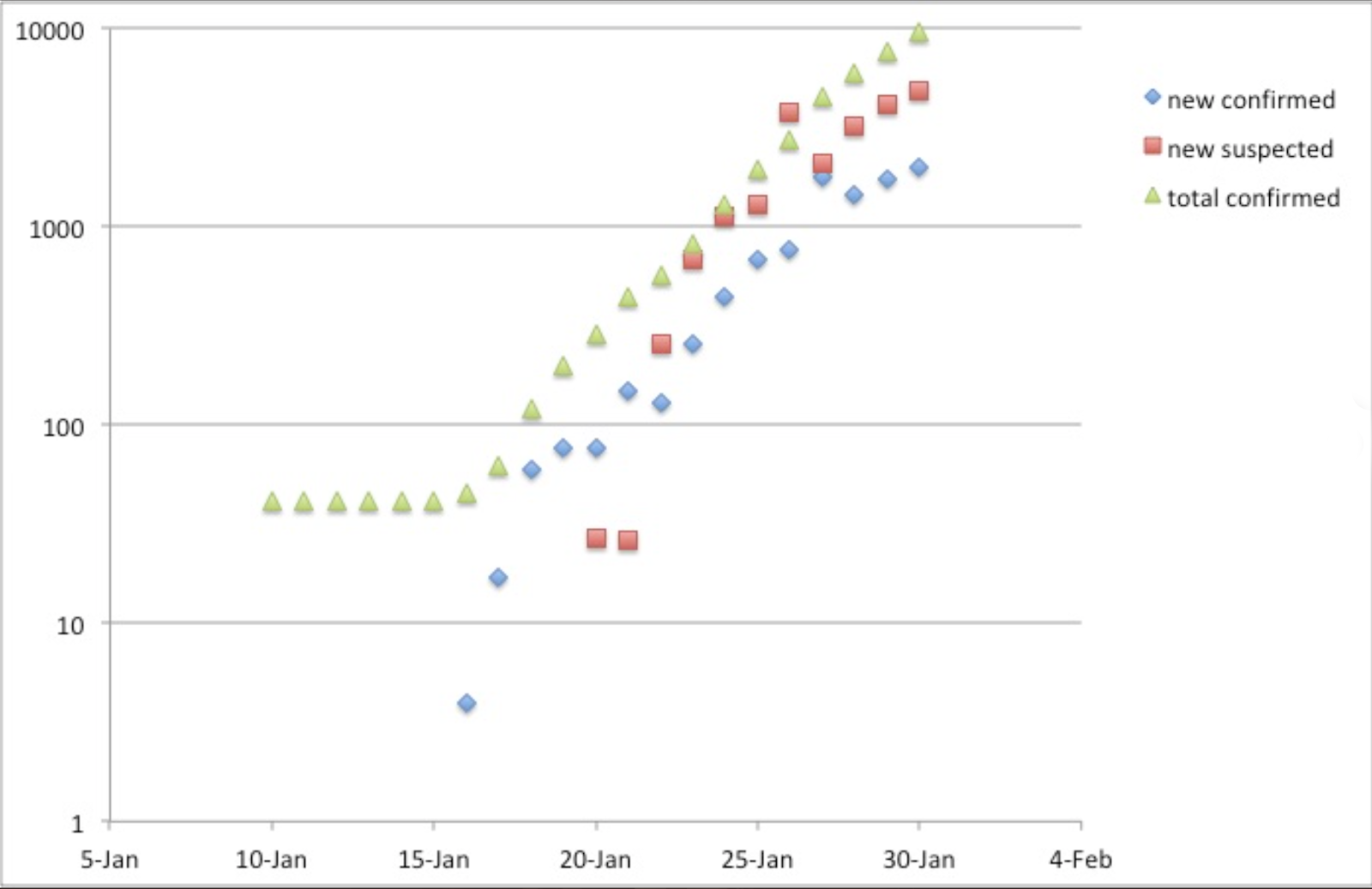 No gráfico acima, temos novos casos confirmados (azul), novos casos suspeitos (vermelho) e a soma de ambos (verde).