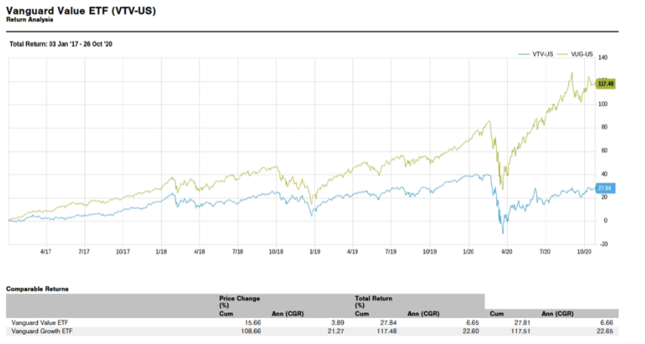 Para não entrarmos em exercícios caprichosos de stock picking, a comparação é feita com base nos típicos ETFs de Value e de Growth da Vanguard.
