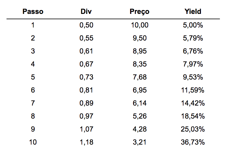 Mesmo nesse exemplo conservador, após dez iterações, teríamos um dividend yield formidável de 9,09% esperando pacientemente por nós, guardado num futuro civilizado no qual a Selic provavelmente estaria muito abaixo disso.