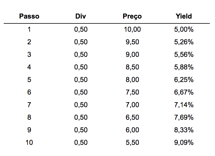 Para uma ação cotada em 10 reais e que distribui 50 centavos de dividendo por ano, temos um dividend yield de 0,50 / 10,00 = 5,00% ao ano.