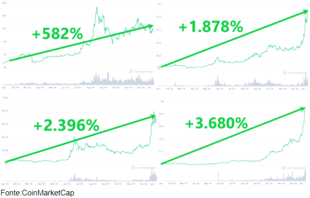 Estou falando de saltos realmente impressionantes, veja só a performance de algumas altcoins em 2020: